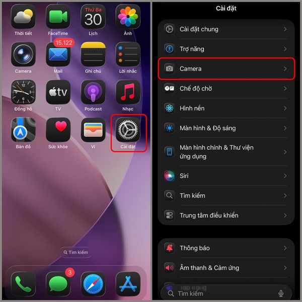 Từ màn hình chính, chọn Cài đặt > Máy ảnh (Camera).